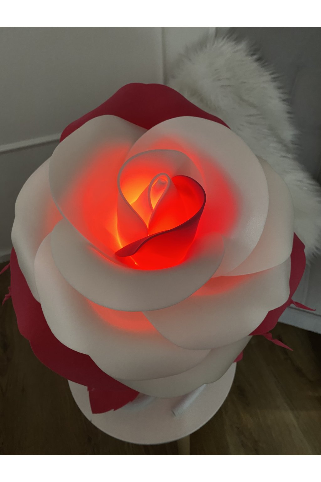 Světlo vložené v květu růže, je poháněno bateriemi 3AAA. Světlo je ovládáno DÁLKOVÝM OVLADAČEM, které na dálku květinu rozsvítí, zhasne a její světlo může změnit na 12 různých barev od bílého světla po červenou, modrou, žlutou, fialovou atd..Ovládání květiny na baterie nám umožňuje, květinu přenést na jakékoliv místo (balkon, terasa, venkovní posezení) kde nám dodá jedinečnou ATMOSFÉRU. Jedná se o dekorativní světlo.